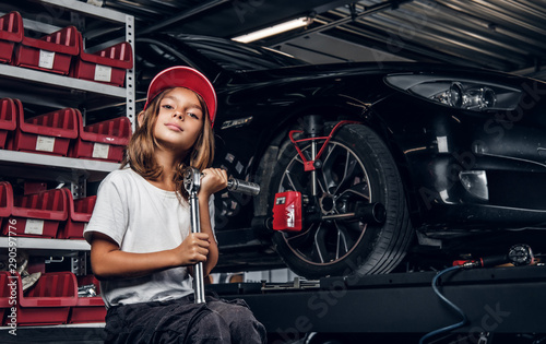 © Fxquadro, Fototapeta premium Pretty girl is posing for photographer while sitting at dark auto service holding big wrench.