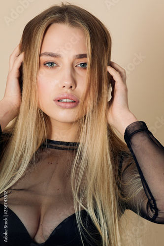 © Serhiy Hipskyy, Obraz premium Pretty girl pose to camera in yellow background studio