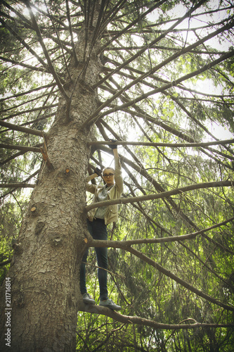 Fototapeta premium Pretty girl standing on a branch tree