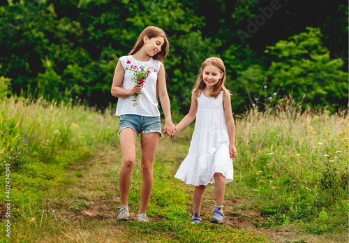 Fototapeta premium Pretty girls walking on summer meadow
