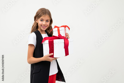 Fototapeta premium Pretty little girl in costume stands with gifts isolated on white background