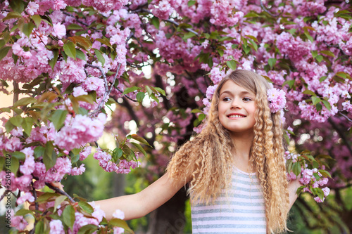 Fototapeta premium Pretty little girl with curly hair in pink dress walking in blossom cherry...