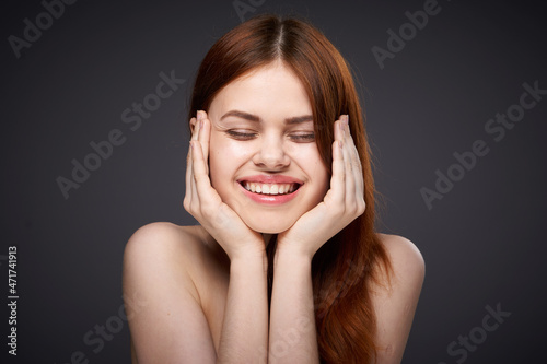 Naklejka premium pretty red-haired woman naked shoulders posing dark background