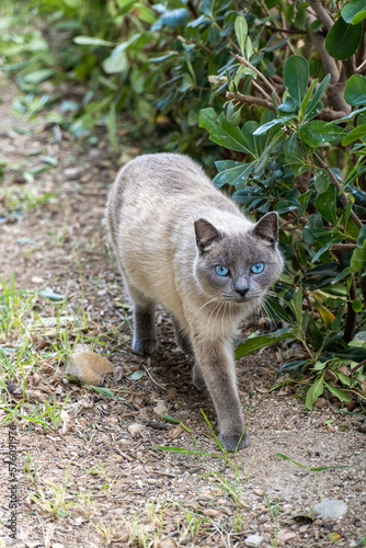Fototapeta premium Pretty siamese cat with blue eyes, walking looking at camera