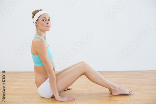 Fototapeta premium Pretty slender woman sitting on floor in sportswear