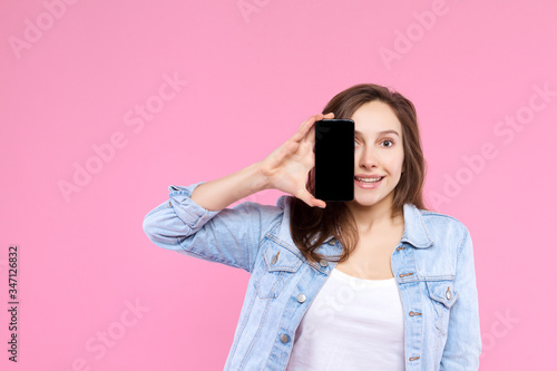 © Monstar Studio, Fototapeta premium Pretty smiling girl is holding in hand smartphone with empty blank screen display. Young woman dressed in denim jacket and white t-shirt on pink background. Modern technology and devices concept.