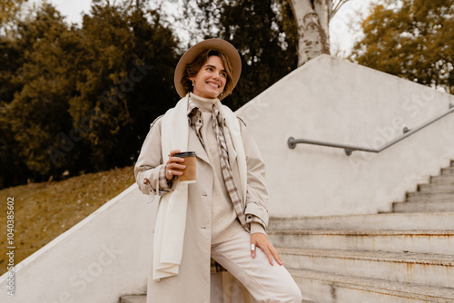 Fototapeta premium pretty smiling woman walking in park in autumn clothes