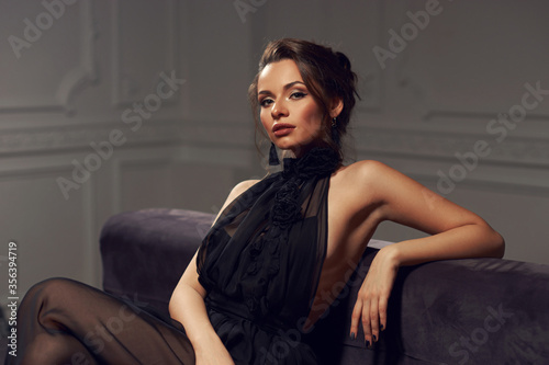 © Dmitry Tsvetkov, Fototapeta premium Pretty stylish girl in black dress with makeup and hairstyle sitting at gray sofa in luxury interior. Fashion style portrait