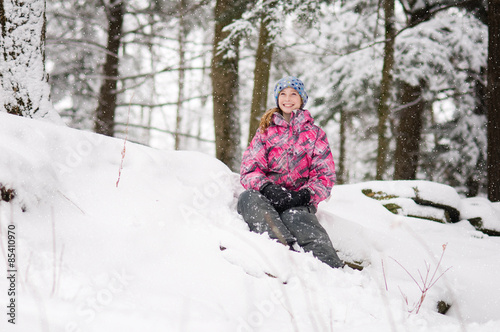 Naklejka premium pretty teen girl playing out in a beautiful snowy forest