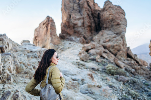 Naklejka premium Pretty tourist brunette girl walking near mountains.