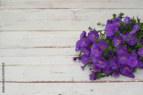 © litts, Fototapeta premium Pretty violet bouquet on white wooden background