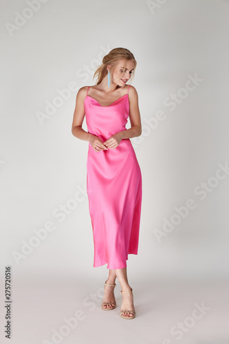 Fototapeta premium Pretty woman beautiful face bright makeup long blond hair fashion model wear trend clothes for date party summer walk travel cruise collection organic silk cotton dress accessory jewelry white studio.