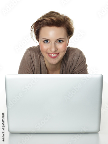 © Karin & Uwe Annas, Naklejka premium Pretty woman behind her laptop surfing on the internet
