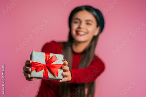 © kohanova1991, Fototapeta premium Pretty woman gives gift and hands it to the camera. She is happy, smiling. Girl on pink background. Positive holiday shot.