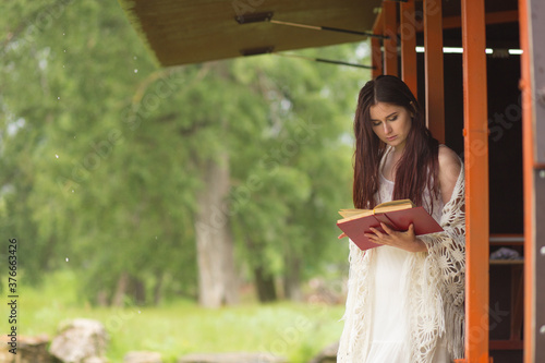 © Alik Mulikov, Naklejka premium Pretty woman in white dress reading book in the cloudy nature. Girl sits on the terrace or on the porch