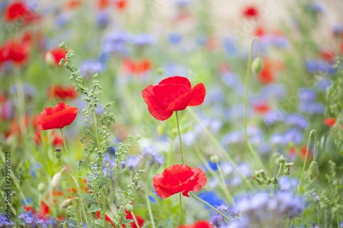 © Inna, Naklejka premium Pretty women holding vase with summer bouquet of wild flowers. Colorful wildflowers background.