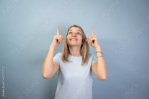 Fototapeta premium pretty young blond attractive woman posing on blue background doing different...