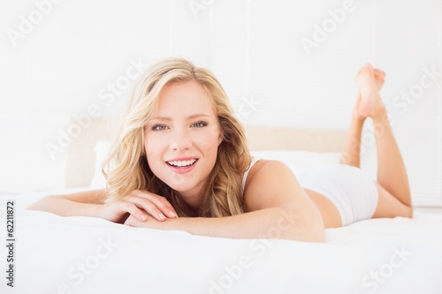 Fototapeta premium Pretty young blonde smiling at camera on bed