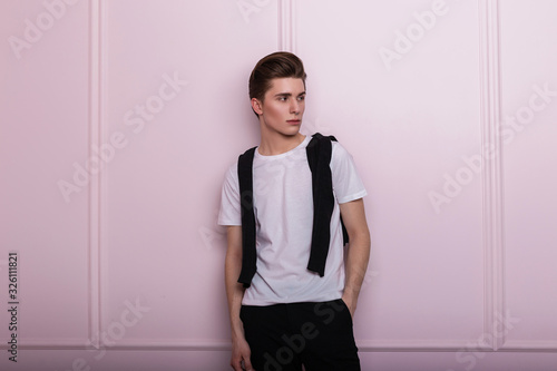 Fototapeta premium Pretty young elegant hipster man with trendy hairstyle in classic black-white clothes posing near pink wall indoors. European cute modern guy in the studio. New youth collection. Fashion menswear.