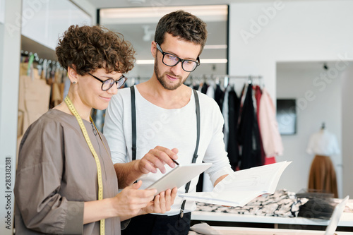 Fototapeta premium Pretty young female tailor and her colleague discussing new ideas