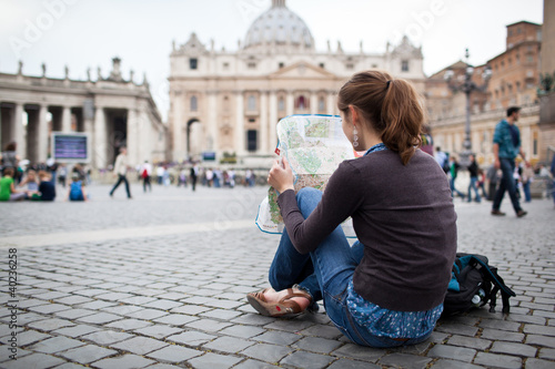 © lightpoet, Fototapeta premium Pretty young female tourist studying a map at St. Peter's square