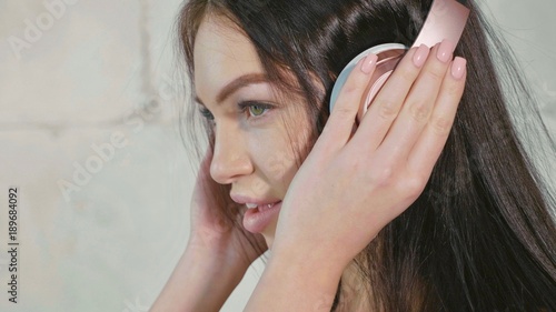 Fototapeta premium Pretty young girl dresses headphone in slow motion