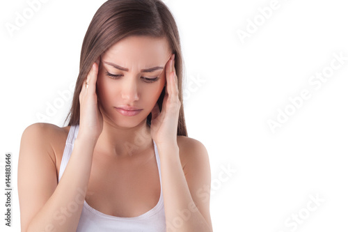 Fototapeta premium Pretty young girl having a headache. sad woman. Young girl bewildered, has a problem