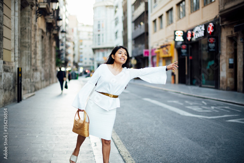 © polojr, Fototapeta premium pretty young latin woman calling a taxi in the city