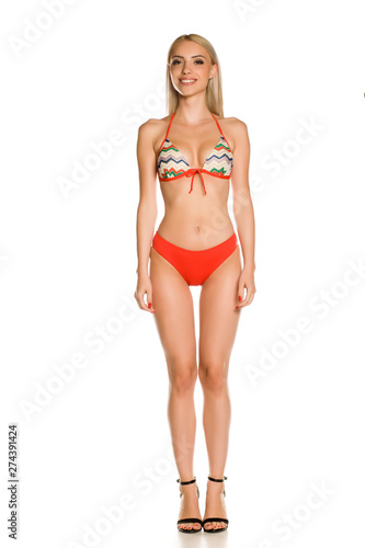© Jasmina, Fototapeta premium Pretty young smiling lady in red bikini swimsuit and sandals on white background