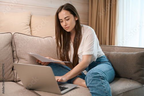 © Svitlana, Naklejka premium Pretty young woman freelancing while checking documents