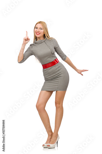 Fototapeta premium Pretty young woman in gray dress isolated on white
