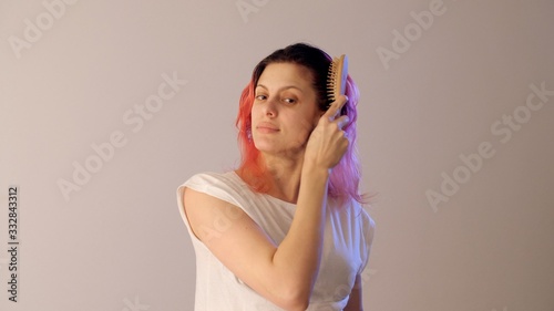 Fototapeta premium Pretty young woman or girl combing her hair with a wooden comb. Beauty and...