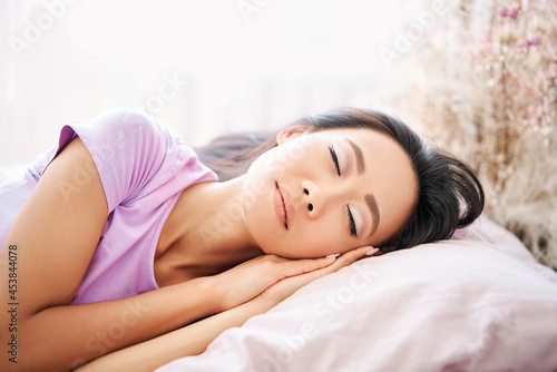 Fototapeta premium Pretty young woman sleeping in her bed and relaxing in the morning