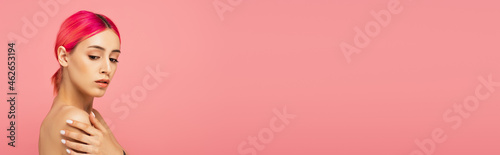© LIGHTFIELD STUDIOS, Fototapeta premium pretty young woman with colorful hair touching bare shoulder isolated on pink, banner