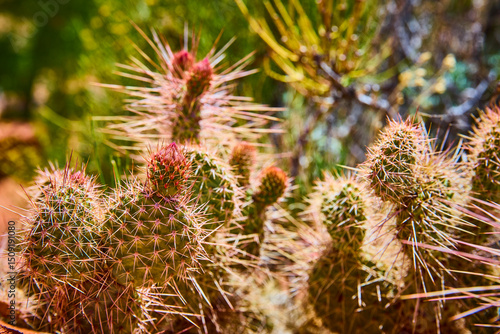 © Nicholas J. Klein, Obraz premium Prickly Desert Cactus Cluster with Buds and Spines Close Up Eye Level View