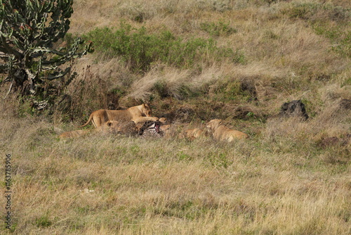 Fototapeta premium pride of lions sharing a kill (zebra) in the Ngorongoro crater in Tanzania