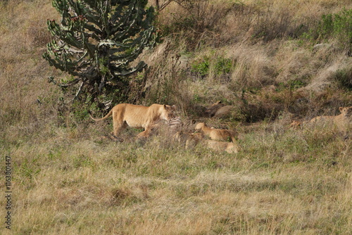 Fototapeta premium pride of lions sharing a kill (zebra) in the Ngorongoro crater in Tanzania