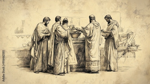 Naklejka premium Priests Consecrating New Garments for the Offering Ceremony, Biblical Illustration from Numbers, Daily Offerings, Beige Background, Ideal for Religious Education and Worship Materials