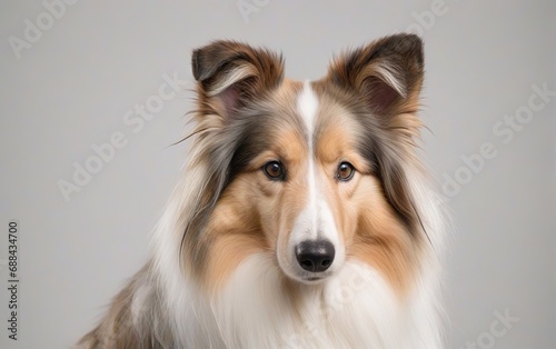 © Jomizu, Fototapeta premium Primer plano de perro de raza Rough Collie o Pastor Escocés sobre fondo blanco