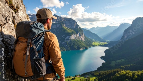 © David Andres, Naklejka premium Primer plano de un mochilero asomado en un risco con maravillosas vistas a un lago y valle entre montañas. Aventura, excursionismo, naturaleza
