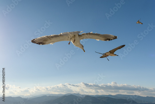© Guillermo, Obraz premium Primer plano de una gaviota realizando un giro mostrando su dorso, con otra ave más pequeña y montañas costeras brumosas en el fondo.