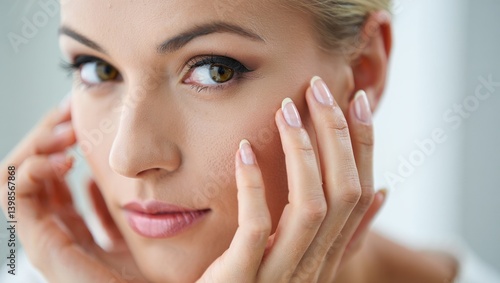© jesus, Fototapeta premium Primer plano de una mujer tocando su oreja con delicadeza mientras el cabello rubio claro enmarca la escena sobre un fondo neutro y desenfocado
