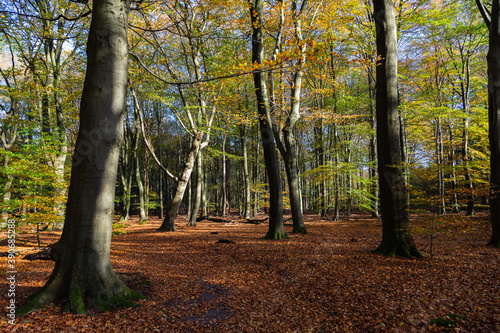 © GM Photos, Fototapeta premium Primeval Dutch forest on a sunny day in November in extreme colorful autumn outfit.