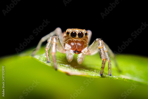 © MarcoMariPhotography, Naklejka premium primo piano di un ragno saltatore poggiato su una foglia di basilico
