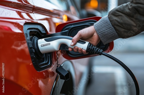 Obraz premium Primo piano di una mano che collega un cavo di ricarica a un'auto elettrica,...