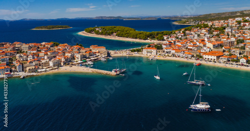 Fototapeta premium Primosten old town panorama. Aerial drone shoot in september 2020