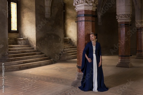 Naklejka premium princess balcony medieval dress ancient young blue dress castle stairs window...