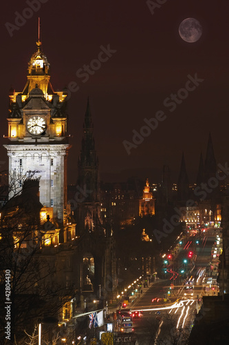 Obraz premium Princess street in Edinburgh at night with full Moon