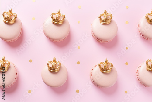 Fototapeta premium Princess themed birthday: delicate pastel pink macarons decorated with a golden crown pattern on a pink background