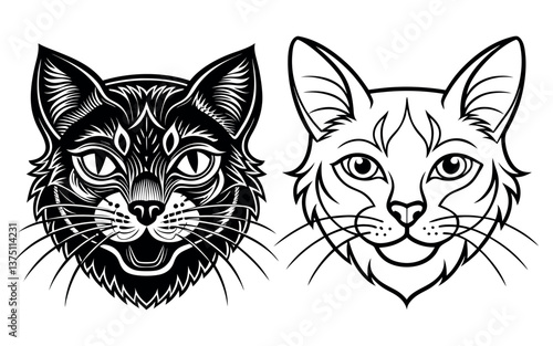 © Aisha, Obraz premium Print cat head tattoo silhouette line art design isolated on white background